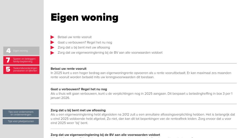 Als u een eigenwoninglening hebt afgesloten na 2012 zult u een annuïtaire aflossingsverplichting hebben. Het is belangrijk dat u eind 2025 voldoende hebt afgelost. Zo niet, dan kan dit tot beperkingen van de renteaftrek leiden. Zorg ervoor dat u voor eind 2025 weer ‘bij’ bent.