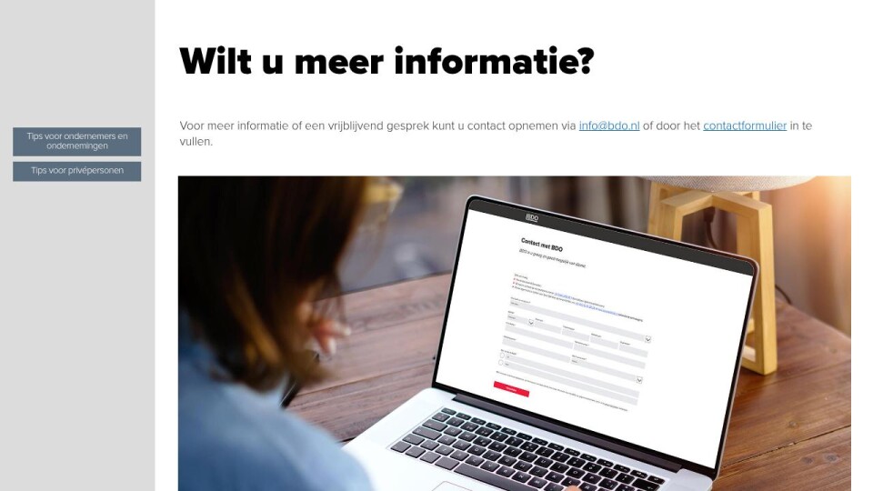 Voor meer informatie of een vrijblijvend gesprek kunt u contact opnemen via info@bdo.nl of door het contactformulier in te vullen.