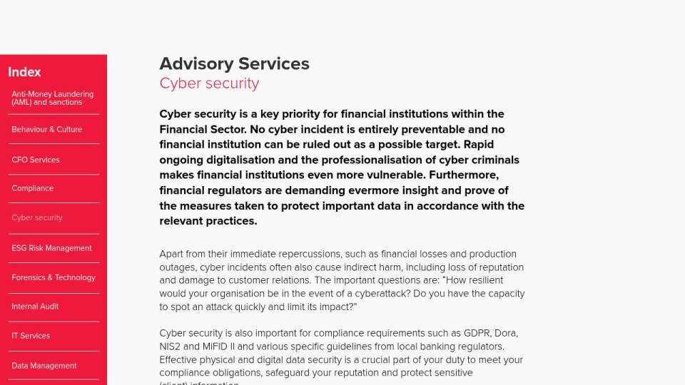 Cyber security is a key priority for financial institutions within the Financial Sector. No cyber incident is entirely preventable and no financial institution can be ruled out as a possible target. Rapid ongoing digitalisation and the professionalisation of cyber criminals makes financial institutions even more vulnerable. Furthermore, financial regulators are demanding evermore insight and prove of the measures taken to protect important data in accordance with the relevant practices.